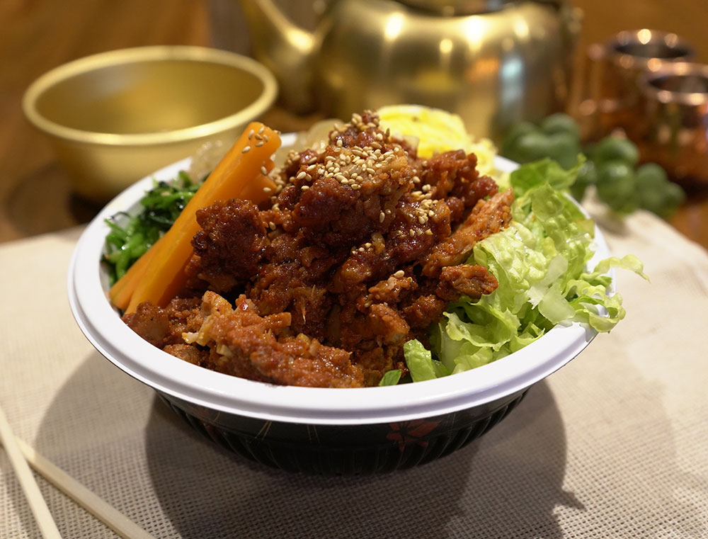 Spicy Chicken, salad, Japchae, egg garnish, Carrot