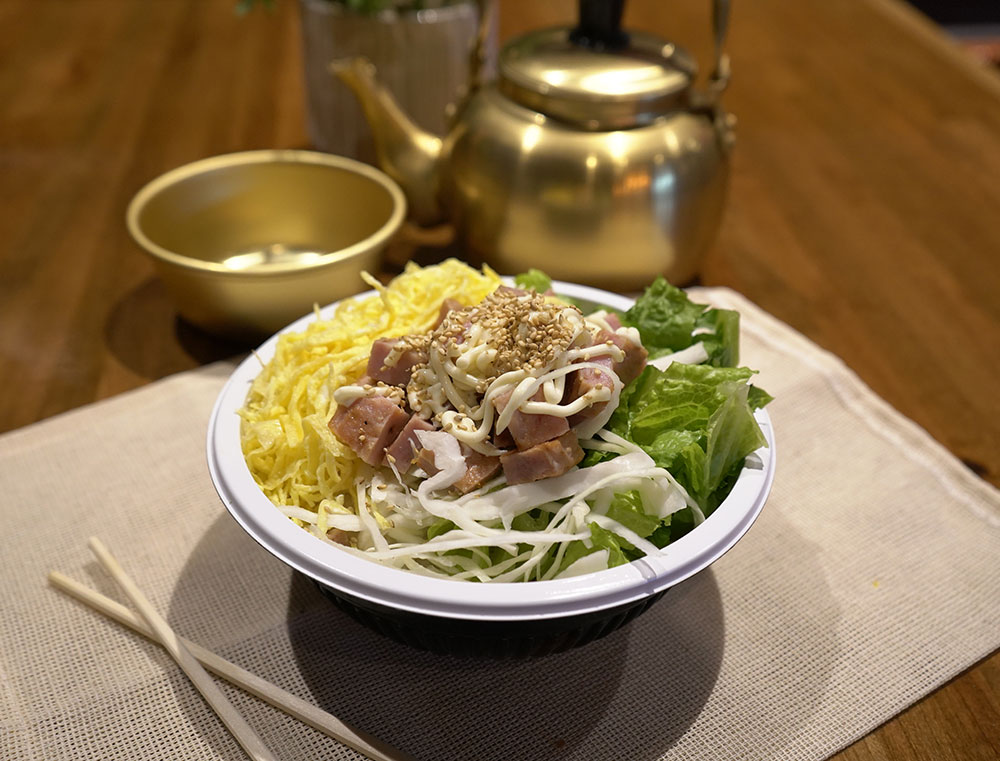 Spam, salad, Japchae, egg garnish, mayonnaise
